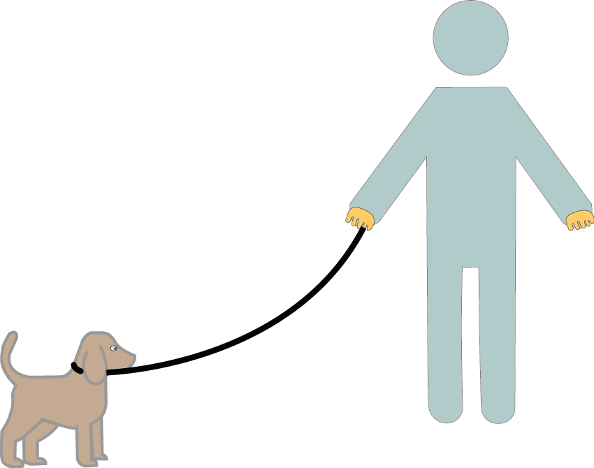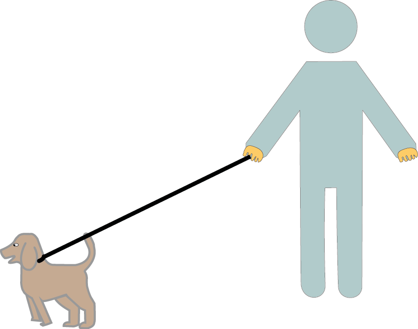 Der Hund ist der Person zugewandt und mit seiner Position wohl einverstanden. Dennoch ist ein Über- und Unterordnungsverhältnis erkennbar: Die Person hat durch die Leine den Bewegungsraum des Hundes festgelegt. Die Leine ist nicht angespannt. Die Person muss den Hund in seinem Verhalten nicht (weiter) einschränken.