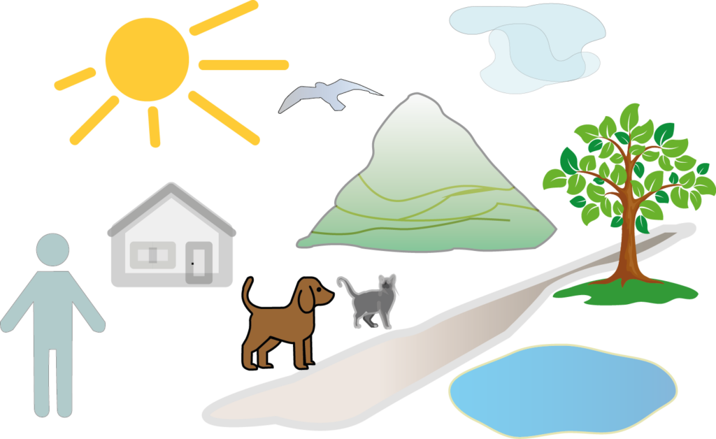 Obige Abbildung soll abstrahiert die Symbolelemente „Person“, „Haus“, „Hund“, „Katze“, „Vogel“, „See“, „Baum“, „Weg“, „Berg“, „Sonne“ und „Wolken“ enthalten.